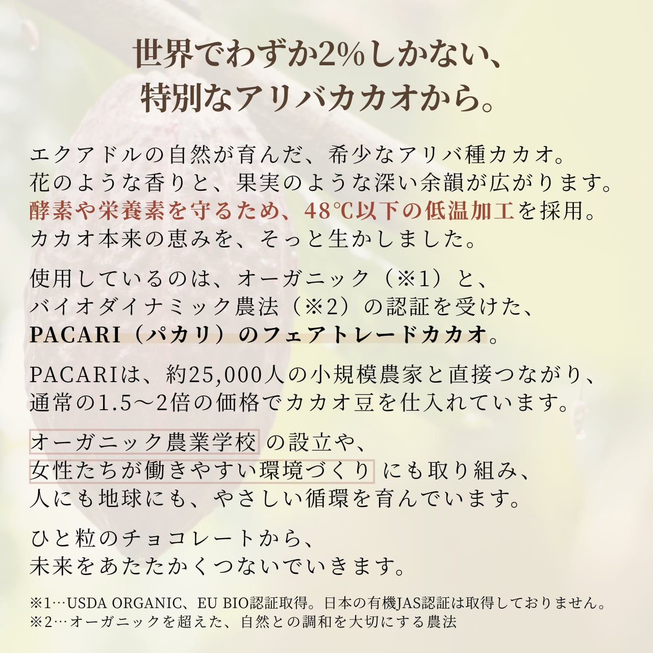 非加熱もしくは低温で焙煎をした「生の状態のカカオ豆」を使用し、製造段階においても48度を超えないよう温度管理をして製造しています。